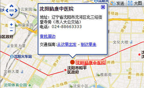 (3)264路在总站路阜新二街站下车,向正东方向走100右转进入通辽街,再走150米左转,走120米再右转进入北三经街,沿北三经街走100米,即可到达沈阳脑康中医院。